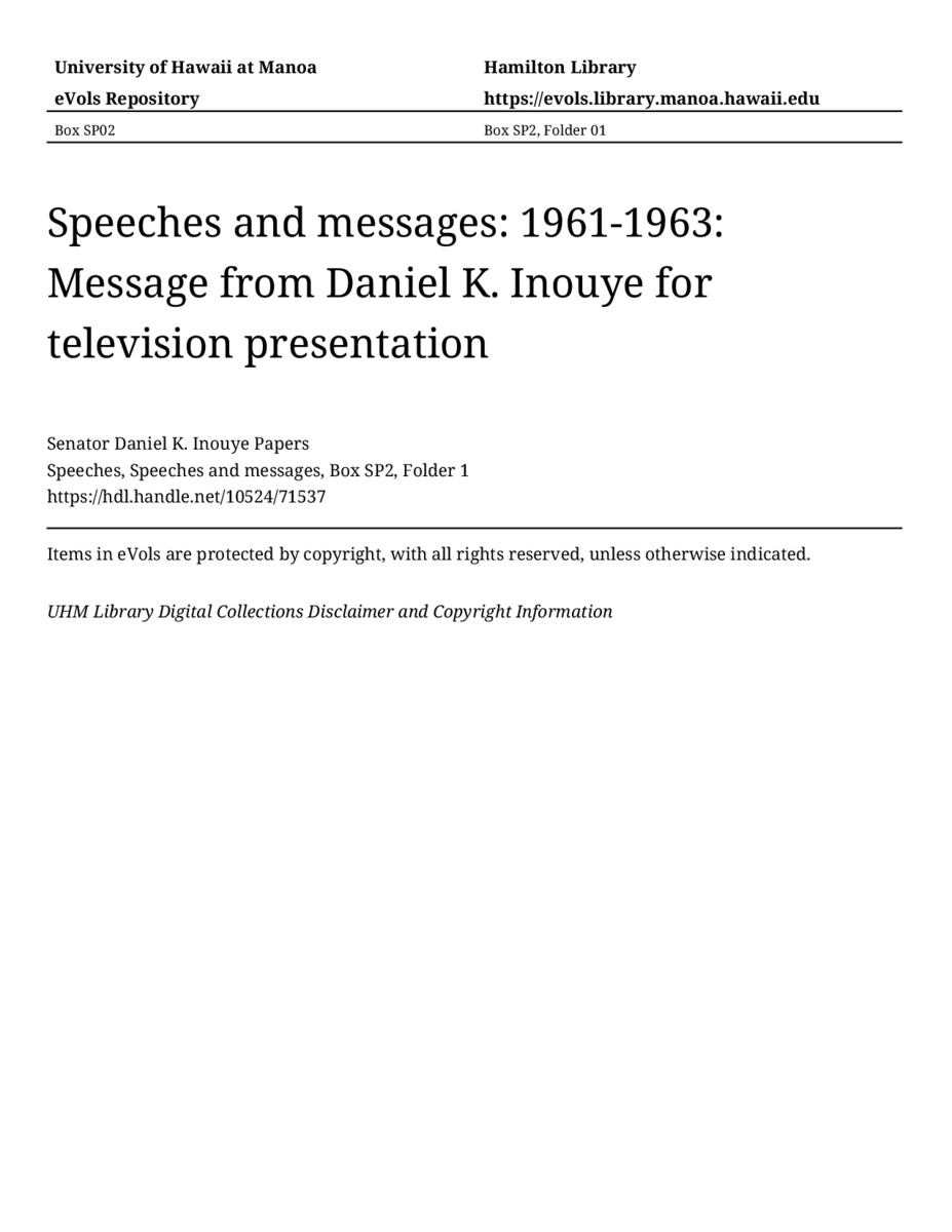 Message from Daniel K. Inouye for television presentation, approximately 1961, MANUSCRIPT-HCPC00011, Speeches, Speeches and messages, Box SP2, Folder 1, Senator Daniel K. Inouye Papers, Hawaiʻi Congressional Papers Collection, University of Hawaiʻi at Mānoa Library, Honolulu, HI. https://omekas-congress.lib.wvu.edu/catalog/10524_71537 (accessed April 21, 2026).