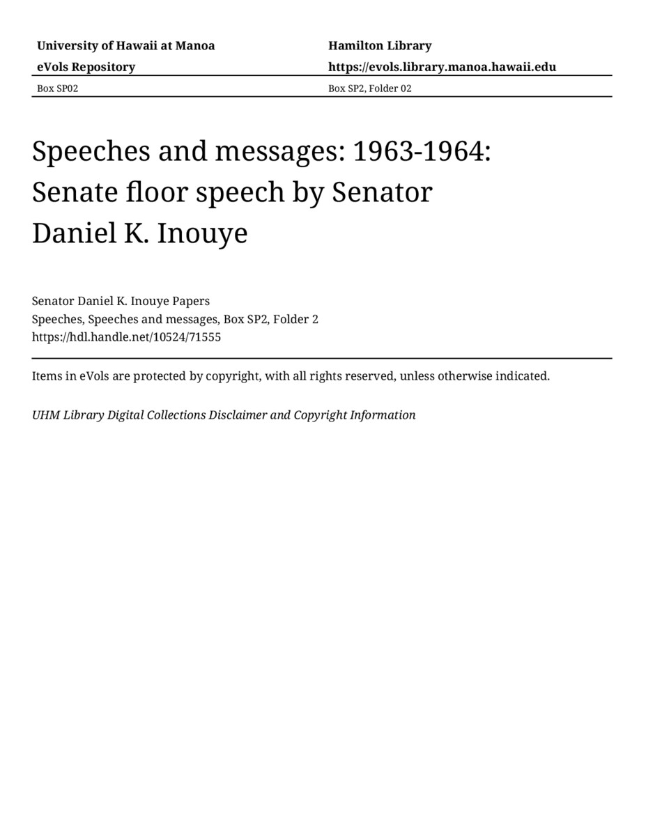 Senate floor speech by Senator Daniel K. Inouye, August 19, 1964, MANUSCRIPT-HCPC00011, Speeches, Speeches and messages, Box SP2, Folder 2, Senator Daniel K. Inouye Papers, Hawaiʻi Congressional Papers Collection, University of Hawaiʻi at Mānoa Library, Honolulu, HI. https://omekas-congress.lib.wvu.edu/catalog/10524_71555 (accessed April 17, 2026).