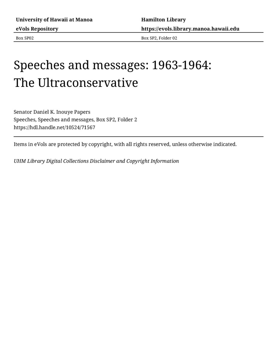 The Ultraconservative, November 9, 1963, MANUSCRIPT-HCPC00011, Speeches, Speeches and messages, Box SP2, Folder 2, Senator Daniel K. Inouye Papers, Hawaiʻi Congressional Papers Collection, University of Hawaiʻi at Mānoa Library, Honolulu, HI. https://omekas-congress.lib.wvu.edu/catalog/10524_71567 (accessed April 10, 2026).