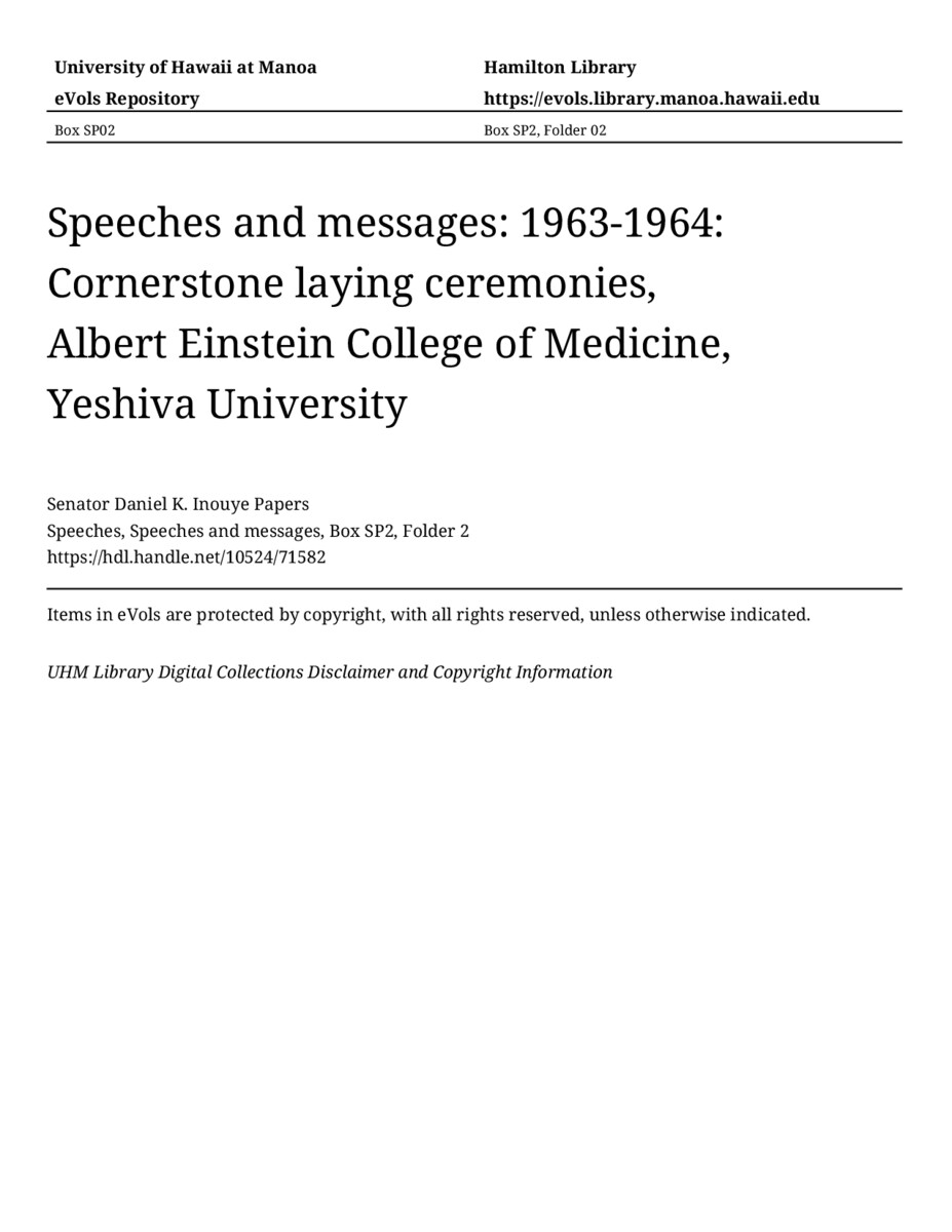 - Cornerstone laying ceremonies, Albert Einstein College of Medicine, Yeshiva University