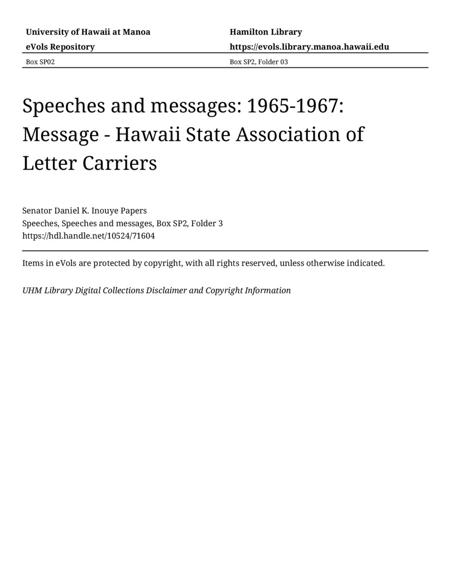 Message - Hawaii State Association of Letter Carriers, March 14, 1967, MANUSCRIPT-HCPC00011, Speeches, Speeches and messages, Box SP2, Folder 3, Senator Daniel K. Inouye Papers, Hawaiʻi Congressional Papers Collection, University of Hawaiʻi at Mānoa Library, Honolulu, HI. https://omekas-congress.lib.wvu.edu/catalog/10524_71604 (accessed April 20, 2026).