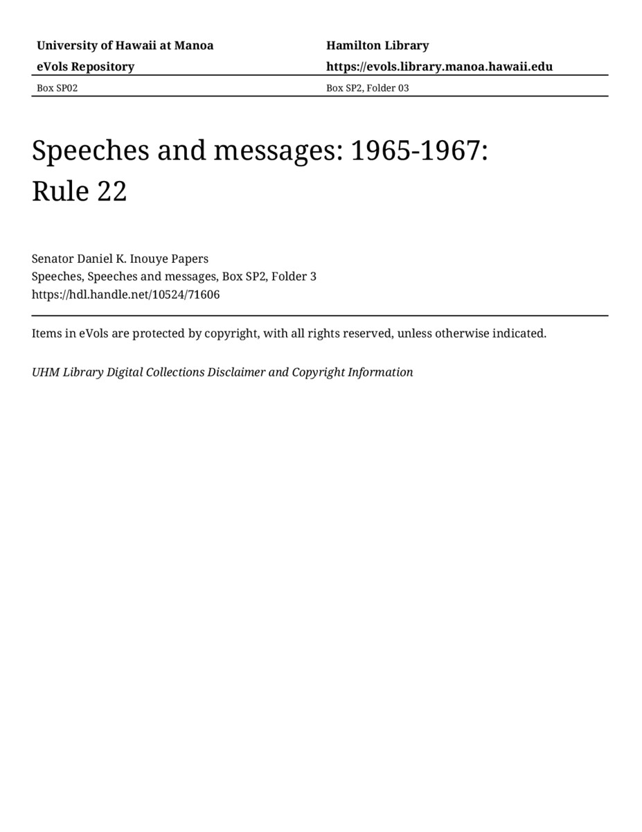 Rule 22, January 25, 1967, MANUSCRIPT-HCPC00011, Speeches, Speeches and messages, Box SP2, Folder 3, Senator Daniel K. Inouye Papers, Hawaiʻi Congressional Papers Collection, University of Hawaiʻi at Mānoa Library, Honolulu, HI. https://omekas-congress.lib.wvu.edu/catalog/10524_71606 (accessed April 10, 2026).