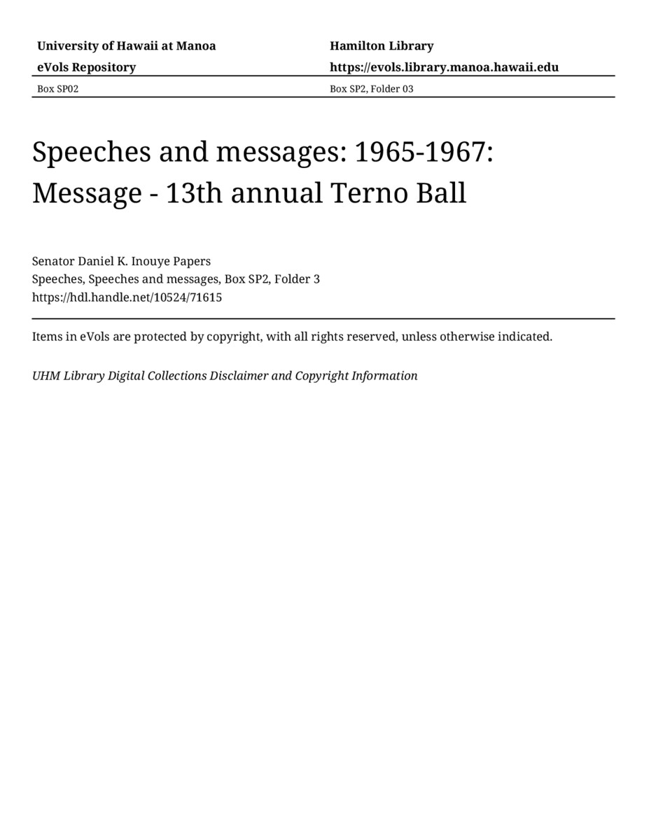 Message - 13th annual Terno Ball, February 9, 1967, MANUSCRIPT-HCPC00011, Speeches, Speeches and messages, Box SP2, Folder 3, Senator Daniel K. Inouye Papers, Hawaiʻi Congressional Papers Collection, University of Hawaiʻi at Mānoa Library, Honolulu, HI. https://omekas-congress.lib.wvu.edu/catalog/10524_71615 (accessed April 20, 2026).
