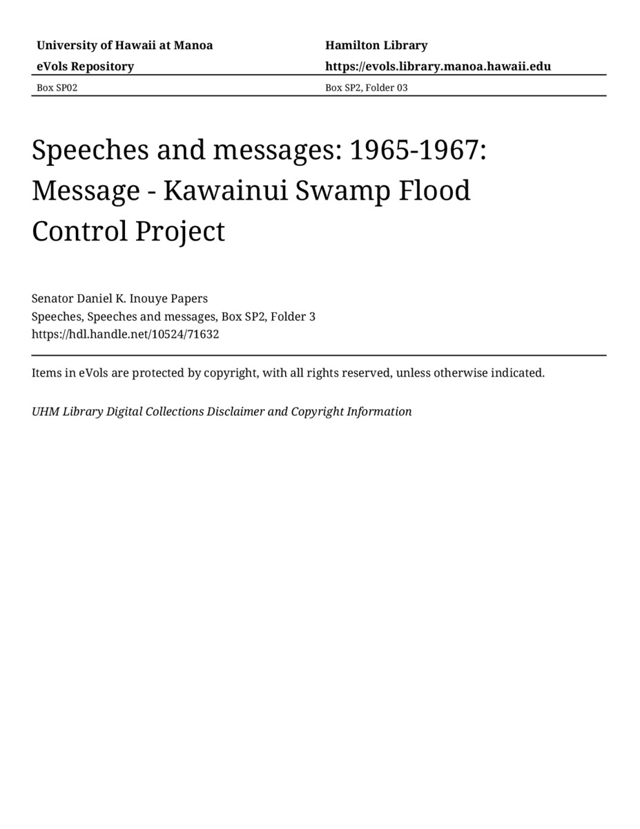 Message - Kawainui Swamp Flood Control Project, June 6, 1966, MANUSCRIPT-HCPC00011, Speeches, Speeches and messages, Box SP2, Folder 3, Senator Daniel K. Inouye Papers, Hawaiʻi Congressional Papers Collection, University of Hawaiʻi at Mānoa Library, Honolulu, HI. https://omekas-congress.lib.wvu.edu/catalog/10524_71632 (accessed April 14, 2026).