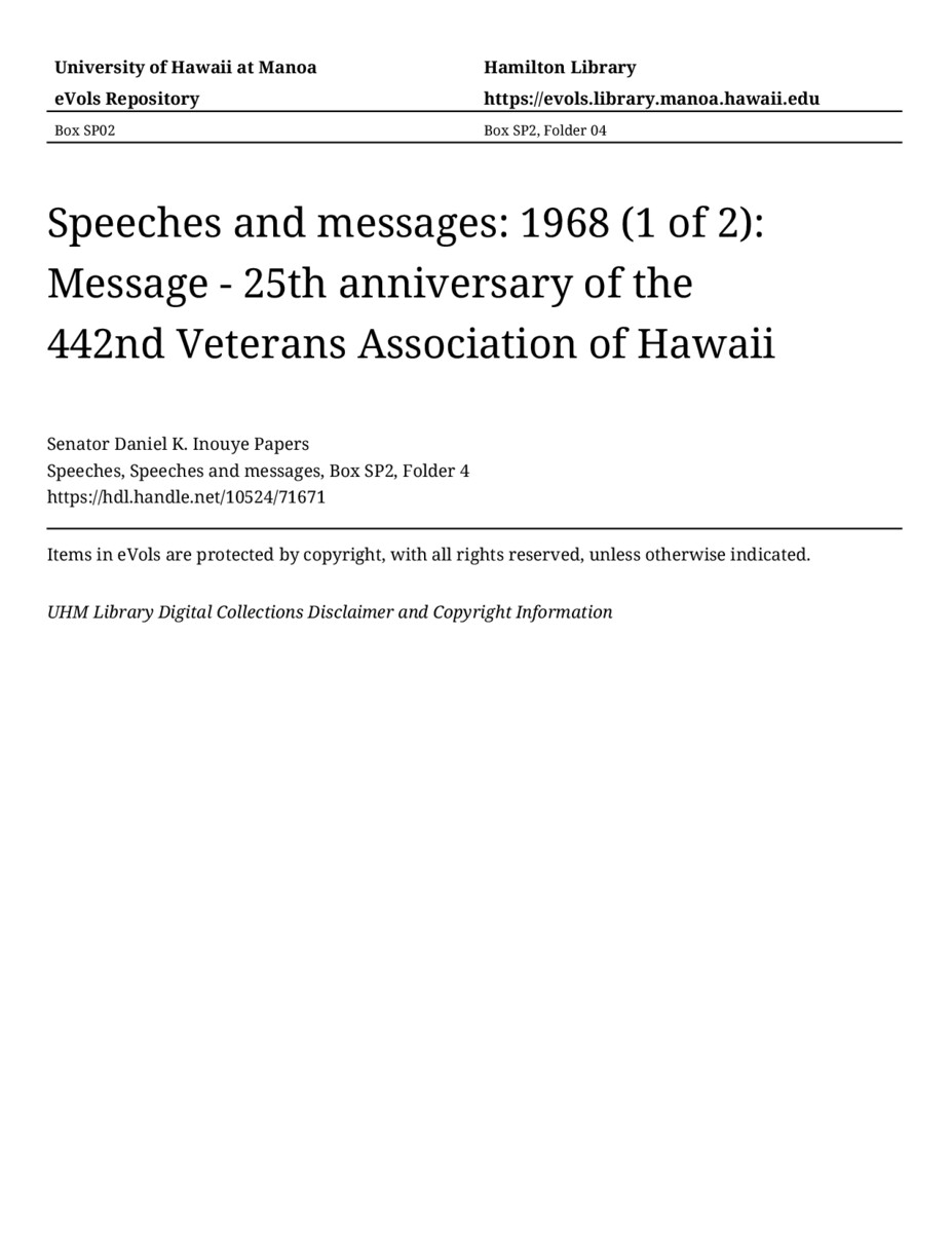 Message - 25th anniversary of the 442nd Veterans Association of Hawaii
