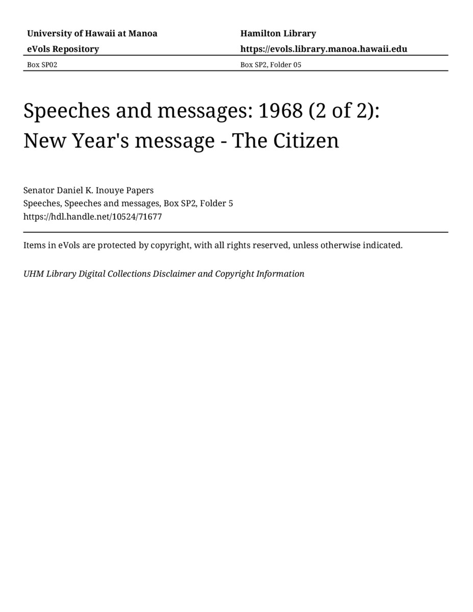 New Year's message - The Citizen, December 9, 1968, MANUSCRIPT-HCPC00011, Speeches, Speeches and messages, Box SP2, Folder 5, Senator Daniel K. Inouye Papers, Hawaiʻi Congressional Papers Collection, University of Hawaiʻi at Mānoa Library, Honolulu, HI. https://omekas-congress.lib.wvu.edu/catalog/10524_71677 (accessed April 23, 2026).