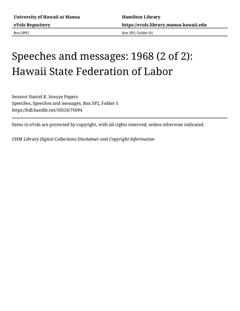 Hawaii State Federation of Labor, September 7, 1968, MANUSCRIPT-HCPC00011, Speeches, Speeches and messages, Box SP2, Folder 5, Senator Daniel K. Inouye Papers, Hawaiʻi Congressional Papers Collection, University of Hawaiʻi at Mānoa Library, Honolulu, HI. https://omekas-congress.lib.wvu.edu/catalog/10524_71694 (accessed April 12, 2026).