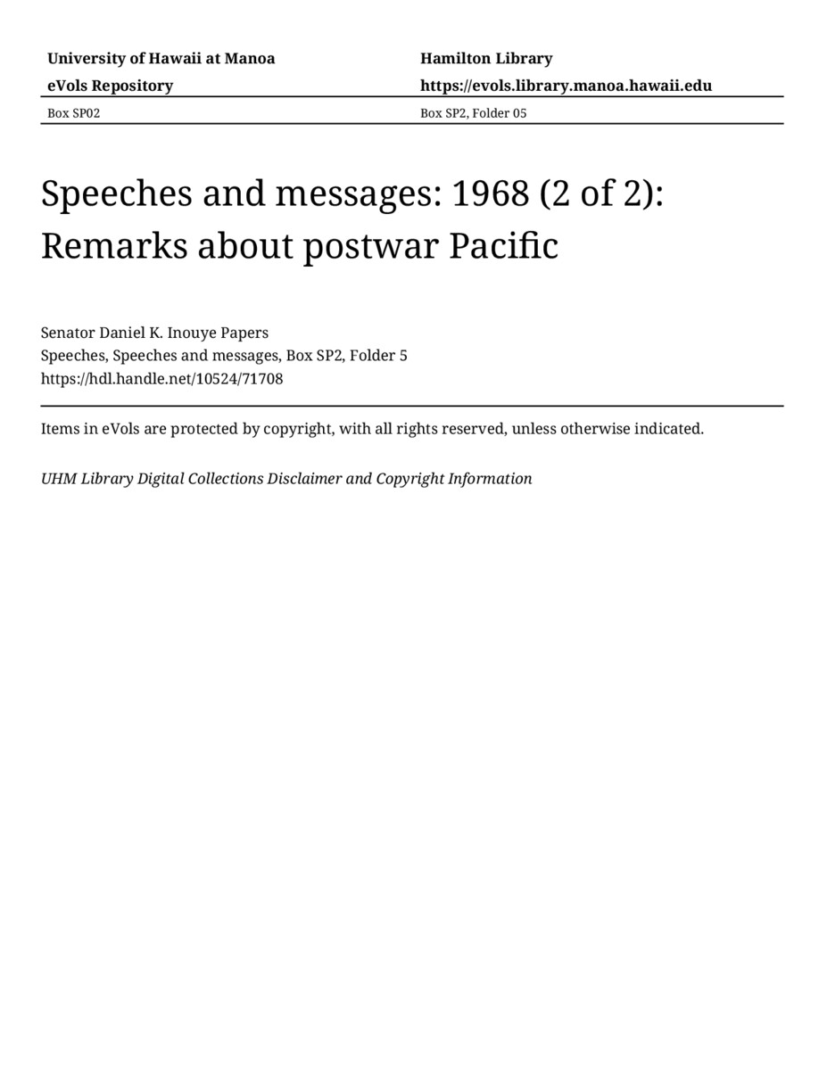 Remarks about postwar Pacific, September 1968, MANUSCRIPT-HCPC00011, Speeches, Speeches and messages, Box SP2, Folder 5, Senator Daniel K. Inouye Papers, Hawaiʻi Congressional Papers Collection, University of Hawaiʻi at Mānoa Library, Honolulu, HI. https://omekas-congress.lib.wvu.edu/catalog/10524_71708 (accessed April 12, 2026).