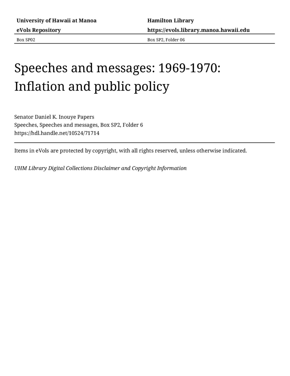 Inflation and public policy, September 29, 1969, MANUSCRIPT-HCPC00011, Speeches, Speeches and messages, Box SP2, Folder 6, Senator Daniel K. Inouye Papers, Hawaiʻi Congressional Papers Collection, University of Hawaiʻi at Mānoa Library, Honolulu, HI. https://omekas-congress.lib.wvu.edu/catalog/10524_71714 (accessed April 11, 2026).