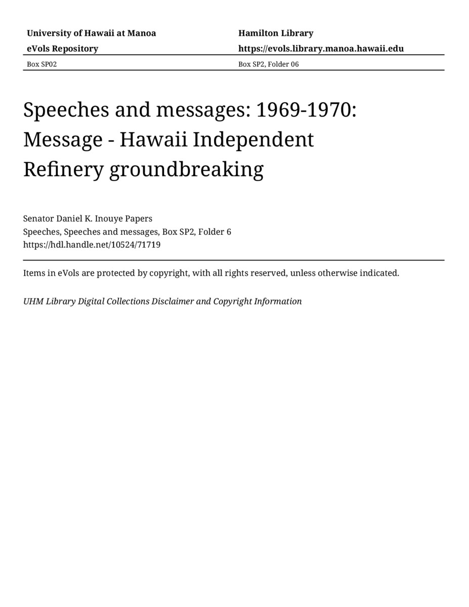 Message - Hawaii Independent Refinery groundbreaking, July 29, 1970, MANUSCRIPT-HCPC00011, Speeches, Speeches and messages, Box SP2, Folder 6, Senator Daniel K. Inouye Papers, Hawaiʻi Congressional Papers Collection, University of Hawaiʻi at Mānoa Library, Honolulu, HI. https://omekas-congress.lib.wvu.edu/catalog/10524_71719 (accessed April 13, 2026).