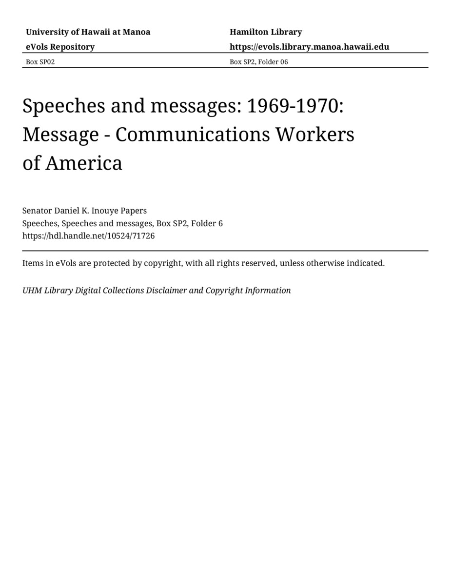 Message - Communications Workers of America, June 2, 1970, MANUSCRIPT-HCPC00011, Speeches, Speeches and messages, Box SP2, Folder 6, Senator Daniel K. Inouye Papers, Hawaiʻi Congressional Papers Collection, University of Hawaiʻi at Mānoa Library, Honolulu, HI. https://omekas-congress.lib.wvu.edu/catalog/10524_71726 (accessed April 10, 2026).