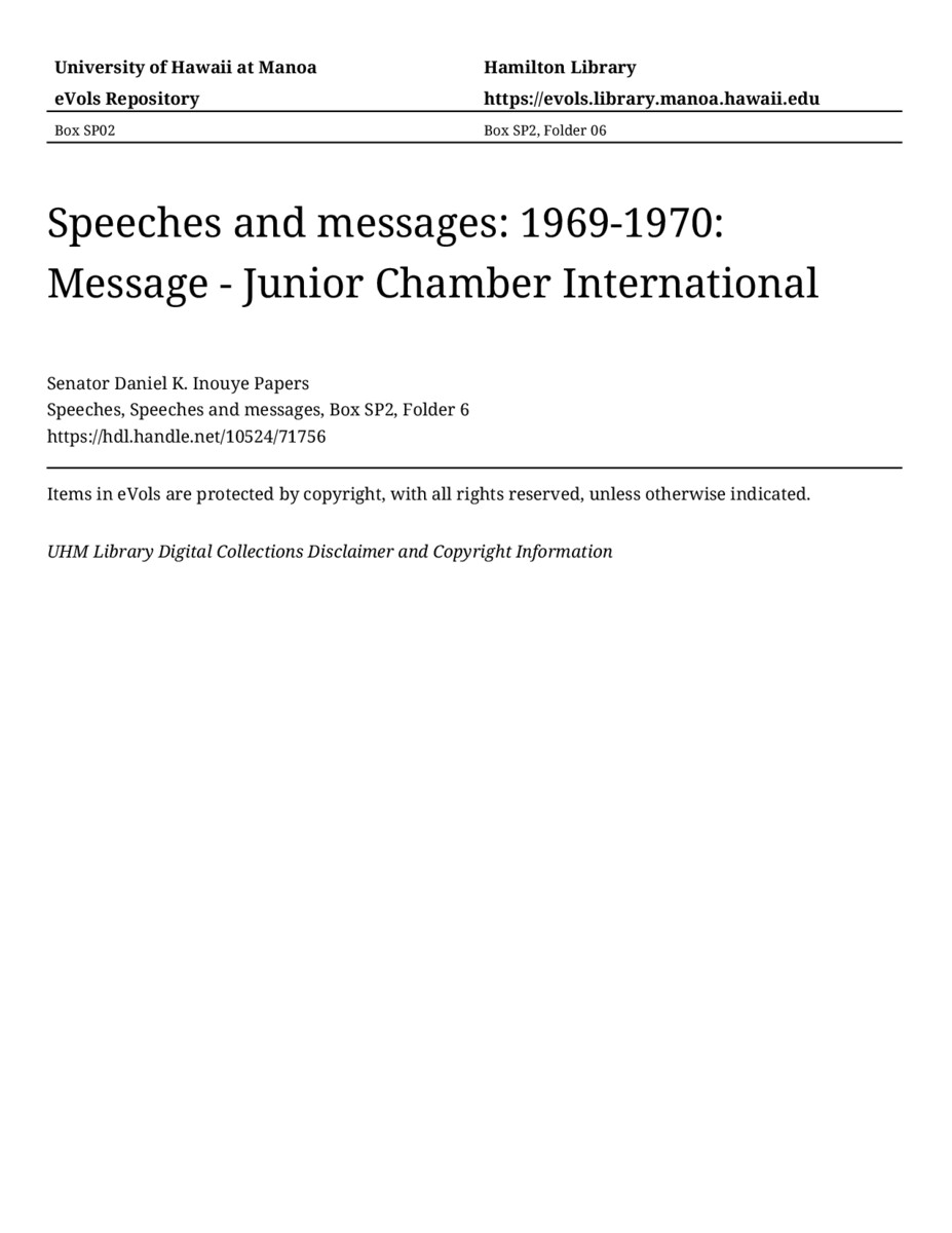 Message - Junior Chamber International, June 9, 1969, MANUSCRIPT-HCPC00011, Speeches, Speeches and messages, Box SP2, Folder 6, Senator Daniel K. Inouye Papers, Hawaiʻi Congressional Papers Collection, University of Hawaiʻi at Mānoa Library, Honolulu, HI. https://omekas-congress.lib.wvu.edu/catalog/10524_71756 (accessed April 22, 2026).