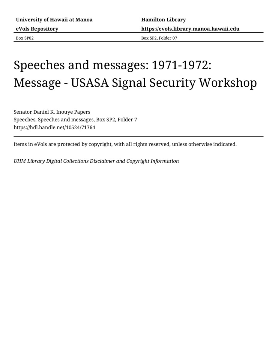 Message - USASA Signal Security Workshop, November 27, 1972, MANUSCRIPT-HCPC00011, Speeches, Speeches and messages, Box SP2, Folder 7, Senator Daniel K. Inouye Papers, Hawaiʻi Congressional Papers Collection, University of Hawaiʻi at Mānoa Library, Honolulu, HI. https://omekas-congress.lib.wvu.edu/catalog/10524_71764 (accessed April 26, 2026).