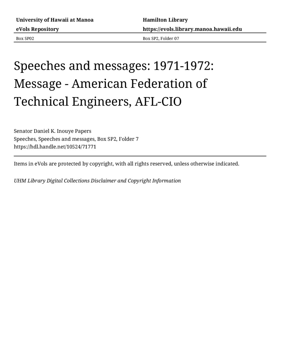 Message - American Federation of Technical Engineers, AFL-CIO, July 17, 1972, MANUSCRIPT-HCPC00011, Speeches, Speeches and messages, Box SP2, Folder 7, Senator Daniel K. Inouye Papers, Hawaiʻi Congressional Papers Collection, University of Hawaiʻi at Mānoa Library, Honolulu, HI. https://omekas-congress.lib.wvu.edu/catalog/10524_71771 (accessed April 17, 2026).