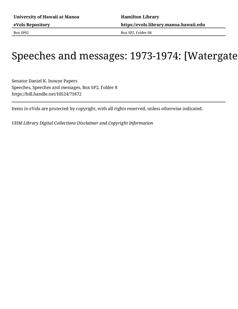 [Watergate], May 19, 1973, MANUSCRIPT-HCPC00011, Speeches, Speeches and messages, Box SP2, Folder 8, Senator Daniel K. Inouye Papers, Hawaiʻi Congressional Papers Collection, University of Hawaiʻi at Mānoa Library, Honolulu, HI. https://omekas-congress.lib.wvu.edu/catalog/10524_71872 (accessed April 11, 2026).