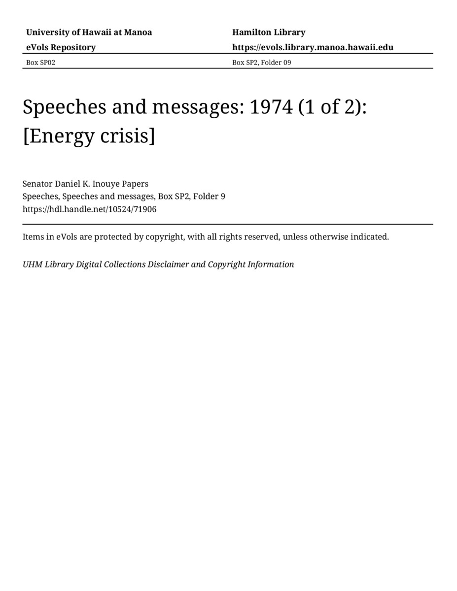 [Energy crisis], June 7, 1974, MANUSCRIPT-HCPC00011, Speeches, Speeches and messages, Box SP2, Folder 9, Senator Daniel K. Inouye Papers, Hawaiʻi Congressional Papers Collection, University of Hawaiʻi at Mānoa Library, Honolulu, HI. https://omekas-congress.lib.wvu.edu/catalog/10524_71906 (accessed April 12, 2026).