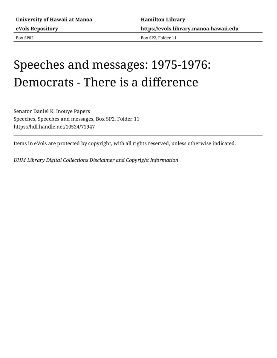 Democrats - There is a difference, May 29, 1976, MANUSCRIPT-HCPC00011, Speeches, Speeches and messages, Box SP2, Folder 11, Senator Daniel K. Inouye Papers, Hawaiʻi Congressional Papers Collection, University of Hawaiʻi at Mānoa Library, Honolulu, HI. https://omekas-congress.lib.wvu.edu/catalog/10524_71947 (accessed April 12, 2026).