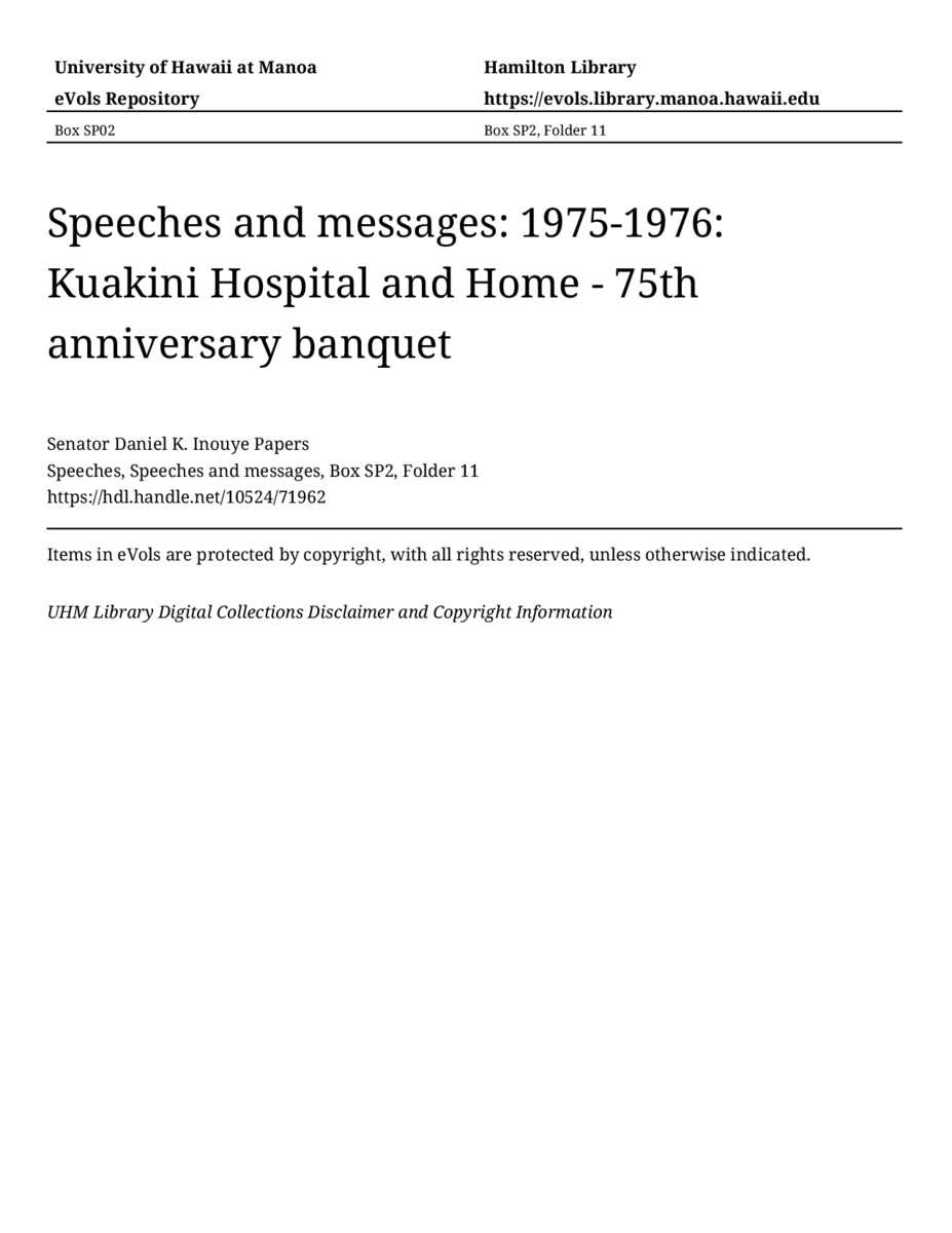 Kuakini Hospital and Home - 75th anniversary banquet, September 12, 1975, MANUSCRIPT-HCPC00011, Speeches, Speeches and messages, Box SP2, Folder 11, Senator Daniel K. Inouye Papers, Hawaiʻi Congressional Papers Collection, University of Hawaiʻi at Mānoa Library, Honolulu, HI. https://omekas-congress.lib.wvu.edu/catalog/10524_71962 (accessed April 12, 2026).