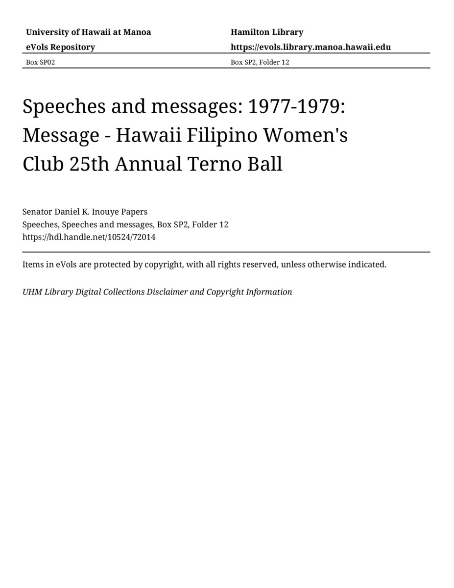Message - Hawaii Filipino Women's Club 25th Annual Terno Ball, February 18, 1979, MANUSCRIPT-HCPC00011, Speeches, Speeches and messages, Box SP2, Folder 12, Senator Daniel K. Inouye Papers, Hawaiʻi Congressional Papers Collection, University of Hawaiʻi at Mānoa Library, Honolulu, HI. https://omekas-congress.lib.wvu.edu/catalog/10524_72014 (accessed April 21, 2026).
