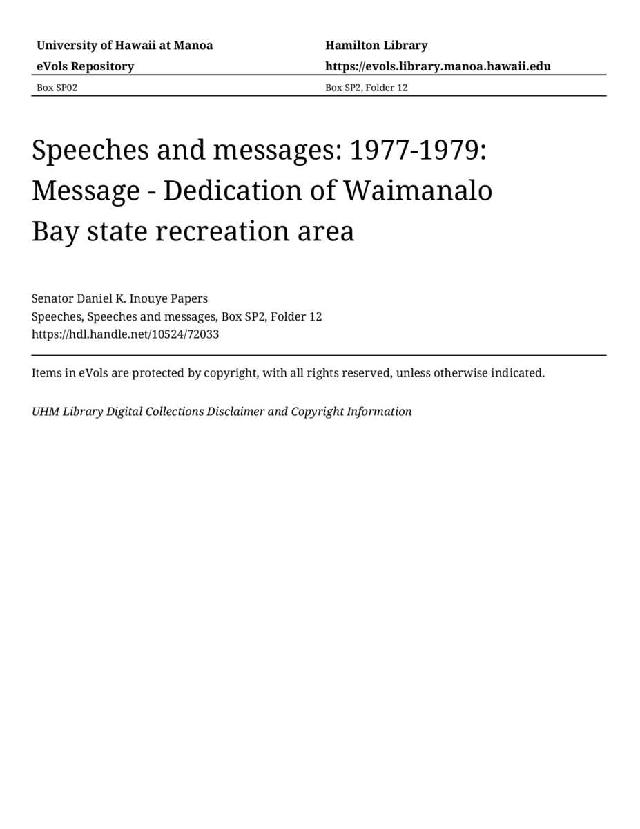Message - Dedication of Waimanalo Bay state recreation area, March 22, 1978, MANUSCRIPT-HCPC00011, Speeches, Speeches and messages, Box SP2, Folder 12, Senator Daniel K. Inouye Papers, Hawaiʻi Congressional Papers Collection, University of Hawaiʻi at Mānoa Library, Honolulu, HI. https://omekas-congress.lib.wvu.edu/catalog/10524_72033 (accessed April 19, 2026).