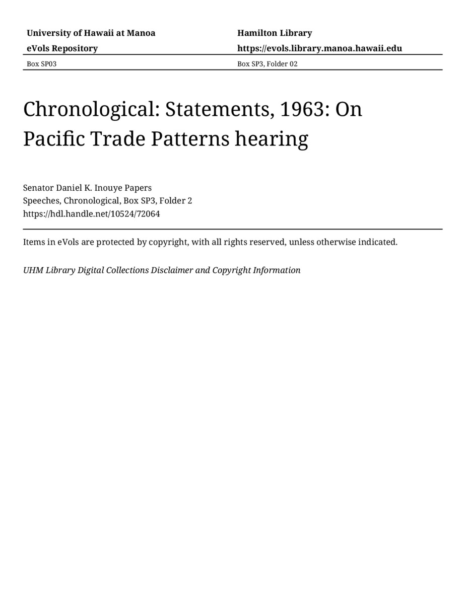 On Pacific Trade Patterns hearing, 1963, MANUSCRIPT-HCPC00011, Speeches, Chronological, Box SP3, Folder 2, Senator Daniel K. Inouye Papers, Hawaiʻi Congressional Papers Collection, University of Hawaiʻi at Mānoa Library, Honolulu, HI. https://omekas-congress.lib.wvu.edu/catalog/10524_72064 (accessed April 27, 2026).