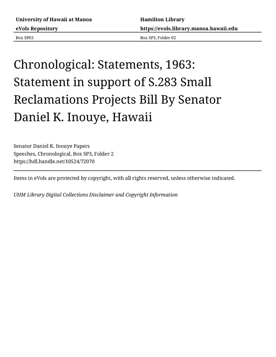 - Statement in support of S.283 Small Reclamations Projects Bill By Senator Daniel K. Inouye, Hawaii