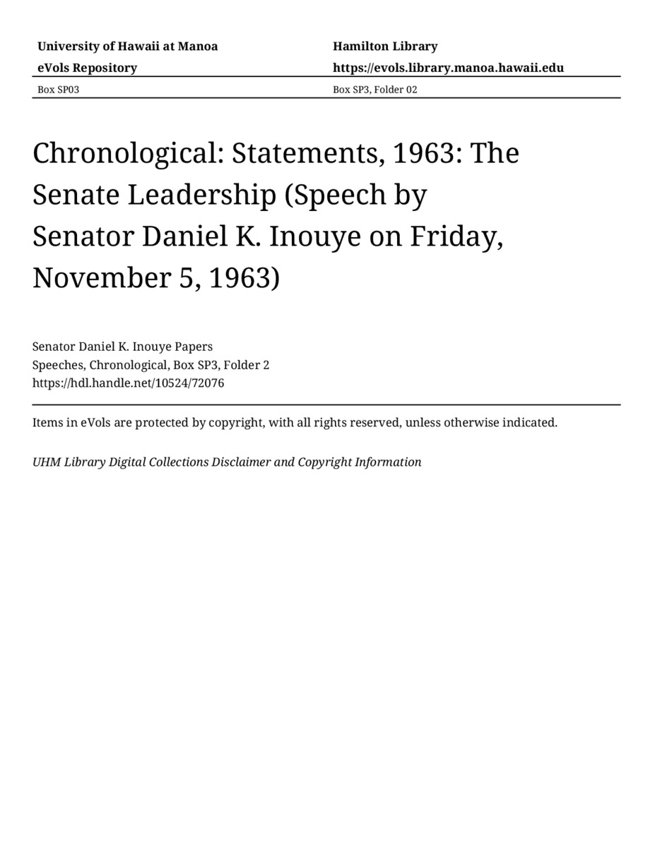 - The Senate Leadership (Speech by Senator Daniel K. Inouye on Friday, November 5, 1963)