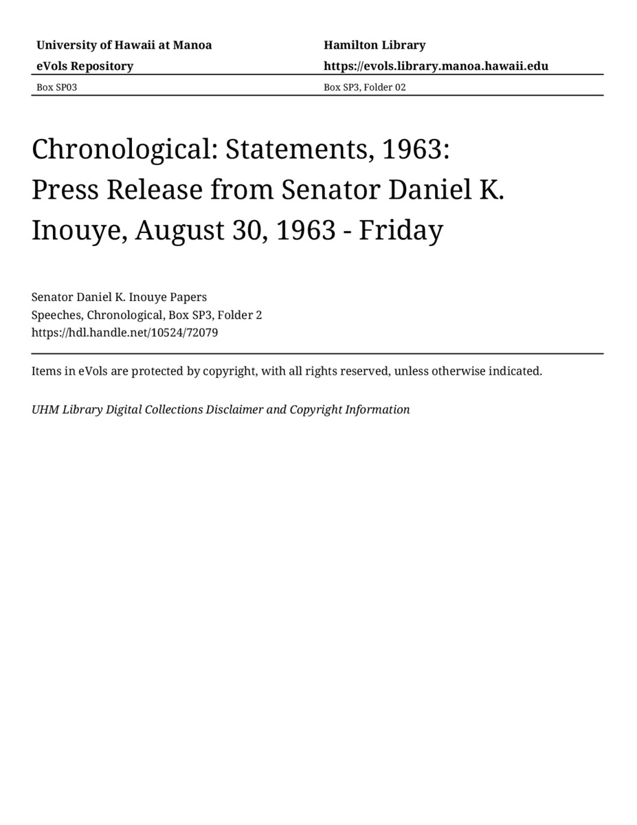 - Press Release from Senator Daniel K. Inouye, August 30, 1963 - Friday