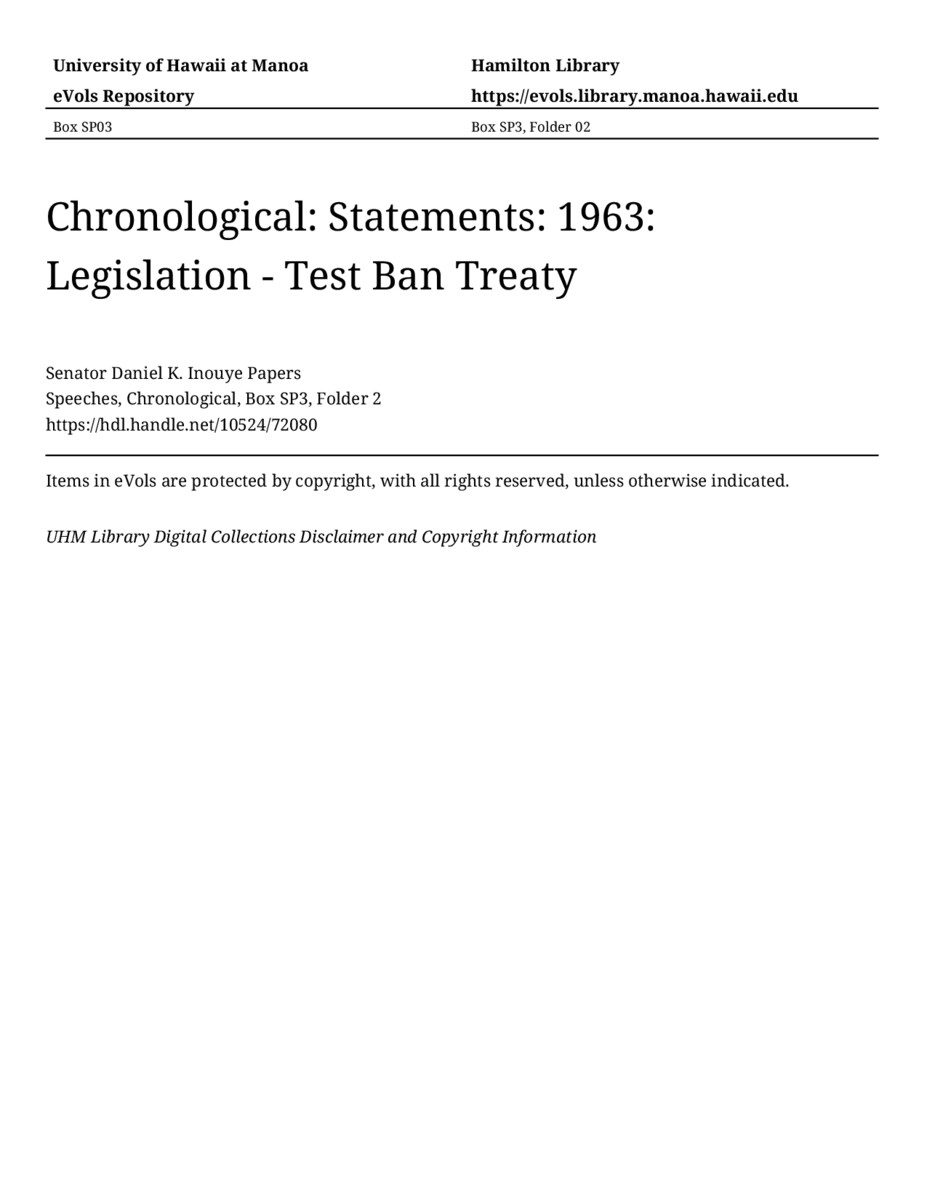Chronological: Statements: 1963: Legislation - Test Ban Treaty, 1963, MANUSCRIPT-HCPC00011, Speeches, Chronological, Box SP3, Folder 2, Senator Daniel K. Inouye Papers, Hawaiʻi Congressional Papers Collection, University of Hawaiʻi at Mānoa Library, Honolulu, HI. https://omekas-congress.lib.wvu.edu/catalog/10524_72080 (accessed April 11, 2026).