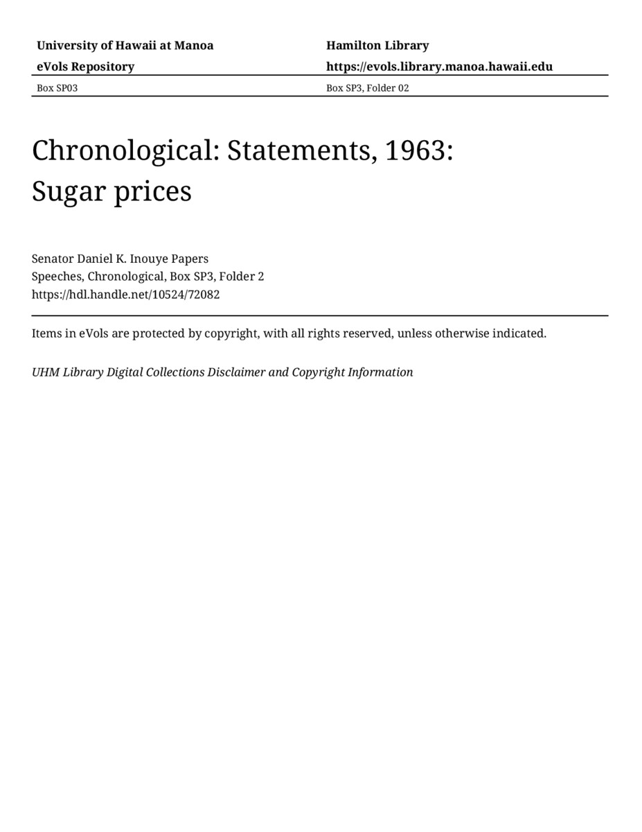 Sugar prices, 1963, MANUSCRIPT-HCPC00011, Speeches, Chronological, Box SP3, Folder 2, Senator Daniel K. Inouye Papers, Hawaiʻi Congressional Papers Collection, University of Hawaiʻi at Mānoa Library, Honolulu, HI. https://omekas-congress.lib.wvu.edu/catalog/10524_72082 (accessed April 11, 2026).