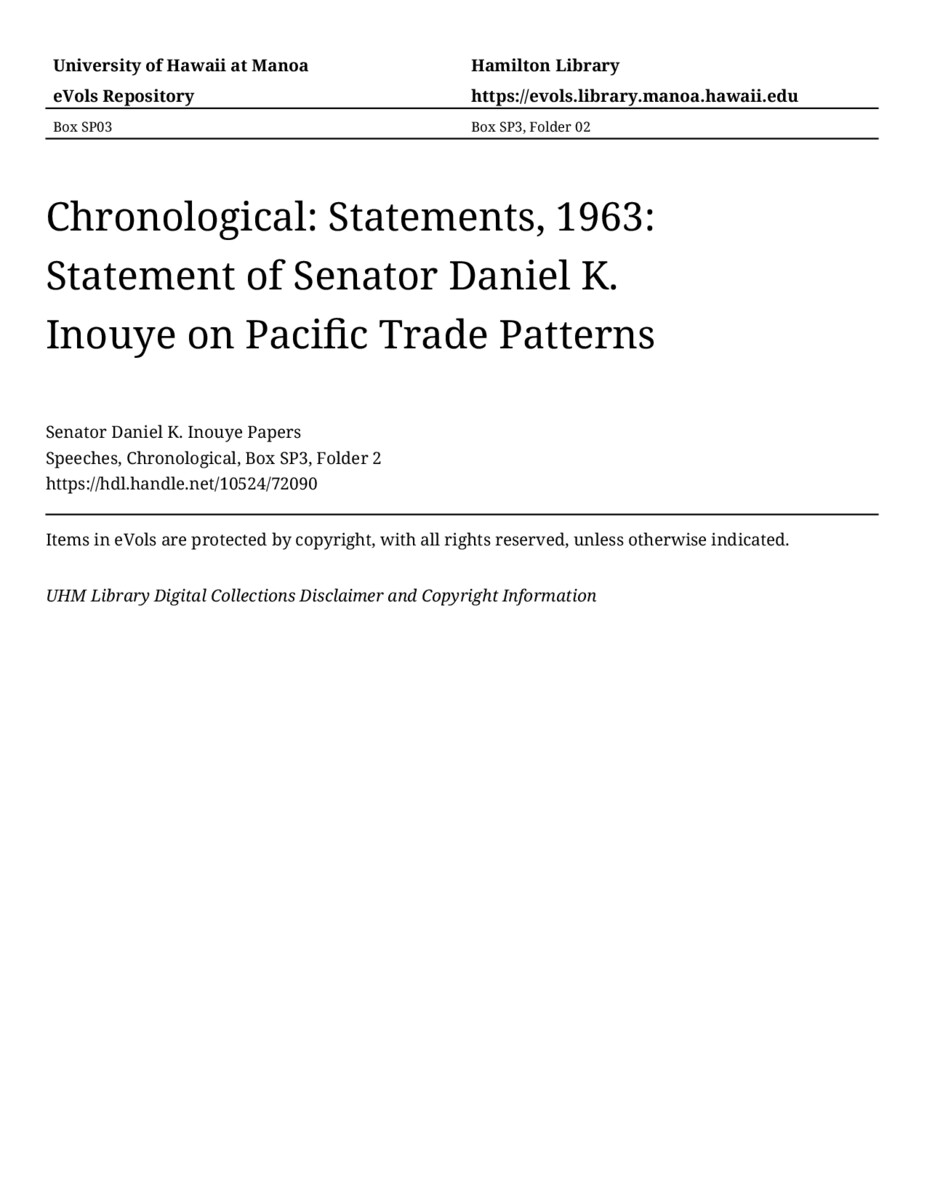 Statement of Senator Daniel K. Inouye on Pacific Trade Patterns, 1963, MANUSCRIPT-HCPC00011, Speeches, Chronological, Box SP3, Folder 2, Senator Daniel K. Inouye Papers, Hawaiʻi Congressional Papers Collection, University of Hawaiʻi at Mānoa Library, Honolulu, HI. https://omekas-congress.lib.wvu.edu/catalog/10524_72090 (accessed April 10, 2026).