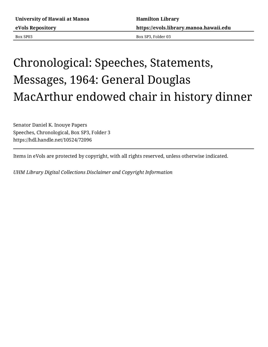 General Douglas MacArthur endowed chair in history dinner, 1964, MANUSCRIPT-HCPC00011, Speeches, Chronological, Box SP3, Folder 3, Senator Daniel K. Inouye Papers, Hawaiʻi Congressional Papers Collection, University of Hawaiʻi at Mānoa Library, Honolulu, HI. https://omekas-congress.lib.wvu.edu/catalog/10524_72096 (accessed April 20, 2026).