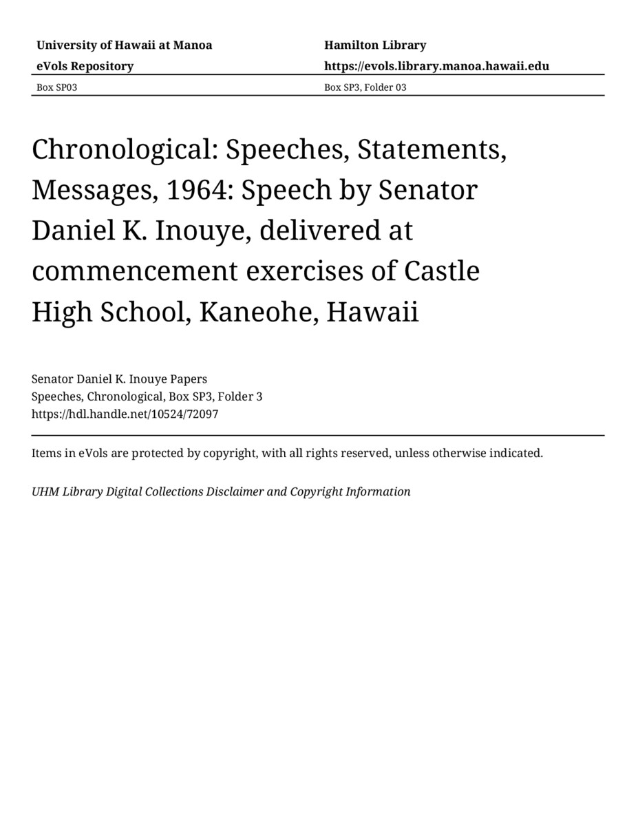- Speech by Senator Daniel K. Inouye, delivered at commencement exercises of Castle High School, Kaneohe, Hawaii