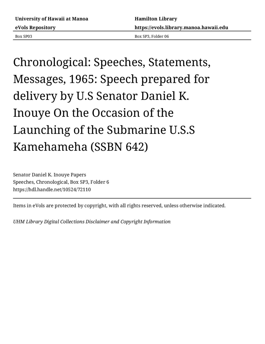Speech prepared for delivery by U.S Senator Daniel K. Inouye On the Occasion of the Launching of the Submarine U.S.S Kamehameha (SSBN 642), January 16, 1965, MANUSCRIPT-HCPC00011, Speeches, Chronological, Box SP3, Folder 6, Senator Daniel K. Inouye Papers, Hawaiʻi Congressional Papers Collection, University of Hawaiʻi at Mānoa Library, Honolulu, HI. https://omekas-congress.lib.wvu.edu/catalog/10524_72110 (accessed April 18, 2026).