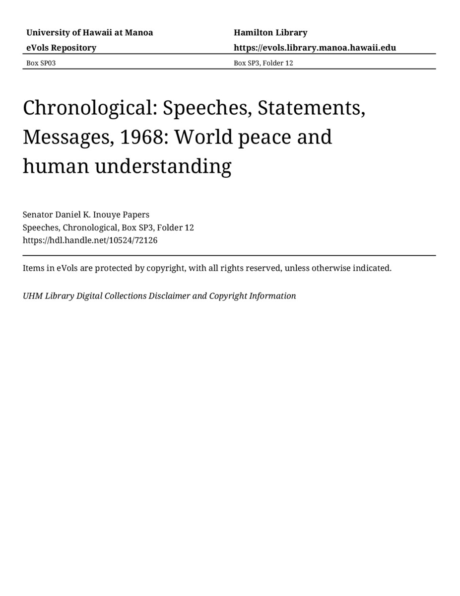 World peace and human understanding, March 22, 1968, MANUSCRIPT-HCPC00011, Speeches, Chronological, Box SP3, Folder 12, Senator Daniel K. Inouye Papers, Hawaiʻi Congressional Papers Collection, University of Hawaiʻi at Mānoa Library, Honolulu, HI. https://omekas-congress.lib.wvu.edu/catalog/10524_72126 (accessed April 10, 2026).