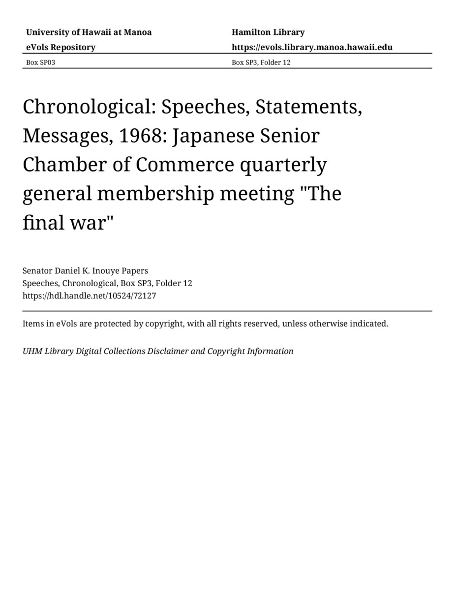 - Japanese Senior Chamber of Commerce quarterly general membership meeting "The final war"