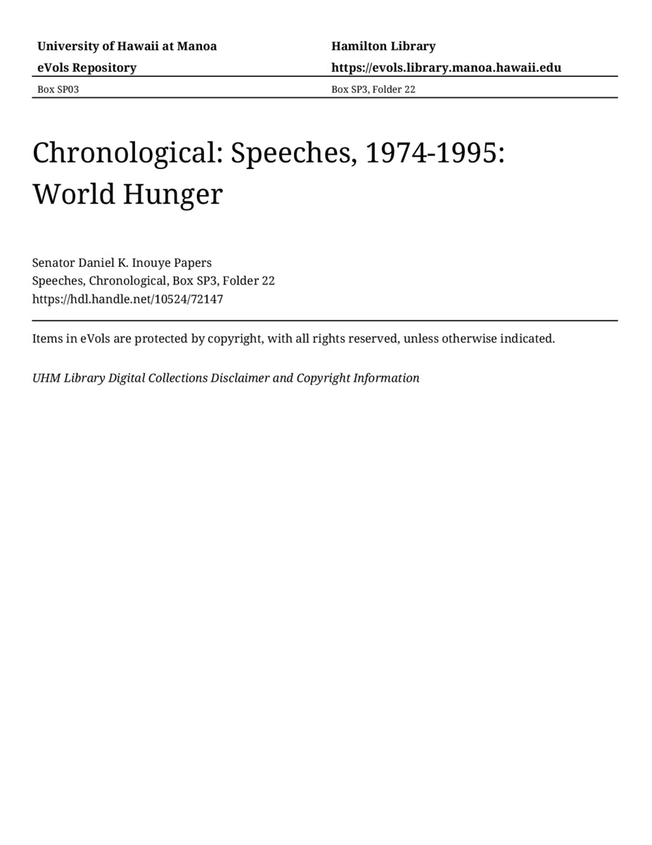 World Hunger, November 5, 1978, MANUSCRIPT-HCPC00011, Speeches, Chronological, Box SP3, Folder 22, Senator Daniel K. Inouye Papers, Hawaiʻi Congressional Papers Collection, University of Hawaiʻi at Mānoa Library, Honolulu, HI. https://omekas-congress.lib.wvu.edu/catalog/10524_72147 (accessed April 19, 2026).