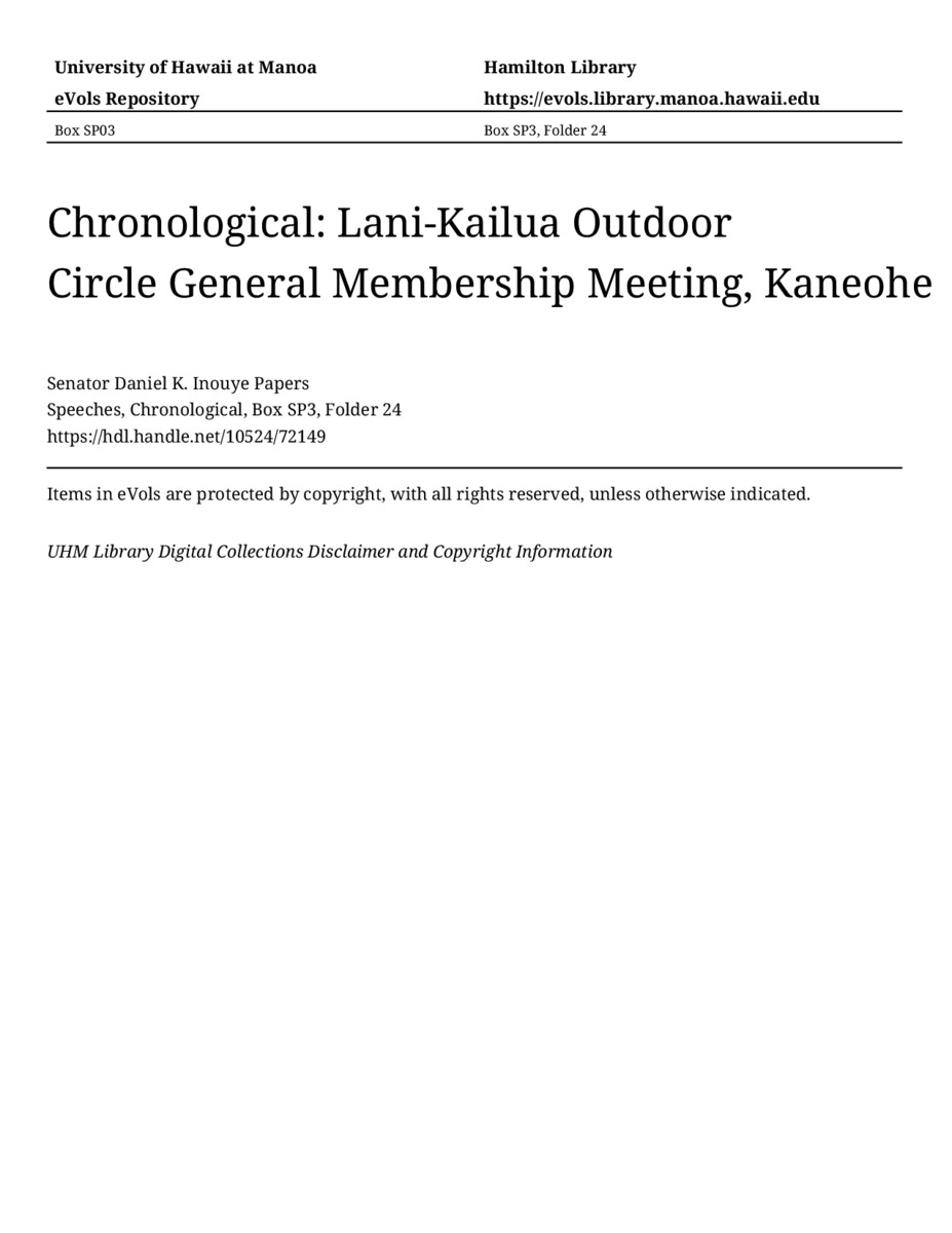 Lani-Kailua Outdoor Circle General Membership Meeting, Kaneohe, February 10, 1975, MANUSCRIPT-HCPC00011, Speeches, Chronological, Box SP3, Folder 24, Senator Daniel K. Inouye Papers, Hawaiʻi Congressional Papers Collection, University of Hawaiʻi at Mānoa Library, Honolulu, HI. https://omekas-congress.lib.wvu.edu/catalog/10524_72149 (accessed April 12, 2026).
