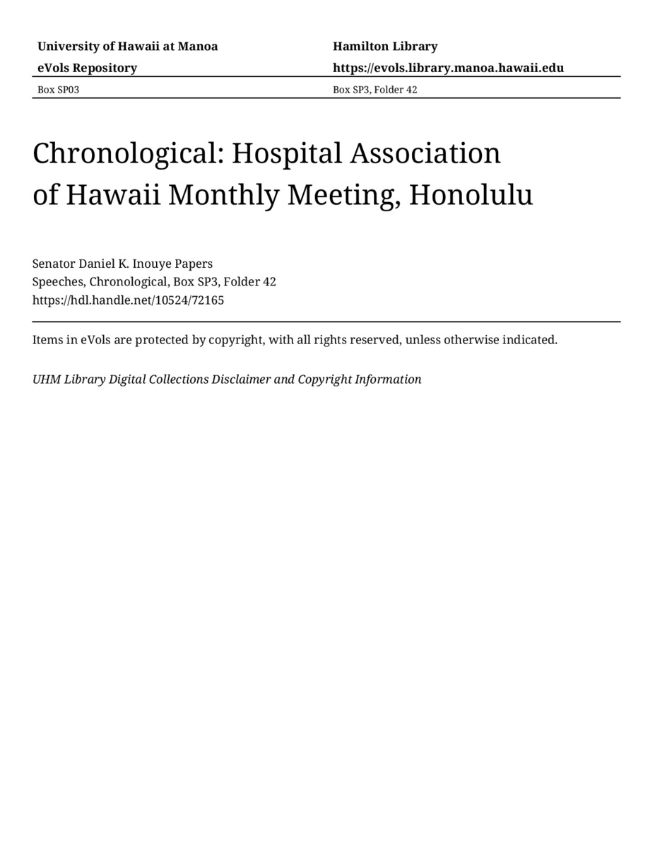 Hospital Association of Hawaii Monthly Meeting, Honolulu, August 8, 1975, MANUSCRIPT-HCPC00011, Speeches, Chronological, Box SP3, Folder 42, Senator Daniel K. Inouye Papers, Hawaiʻi Congressional Papers Collection, University of Hawaiʻi at Mānoa Library, Honolulu, HI. https://omekas-congress.lib.wvu.edu/catalog/10524_72165 (accessed April 12, 2026).