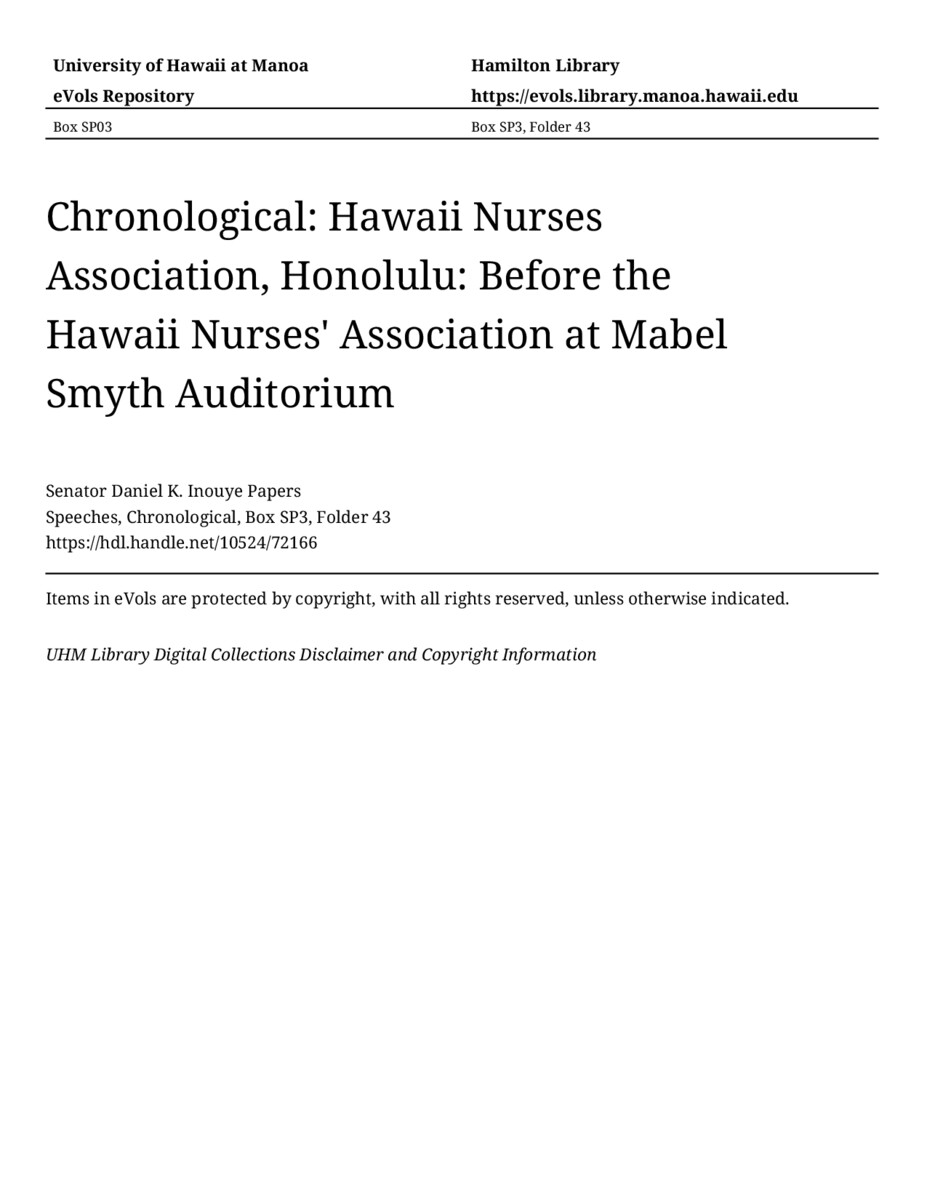 - Hawaii Nurses Association, Honolulu: Before the Hawaii Nurses' Association at Mabel Smyth Auditorium
