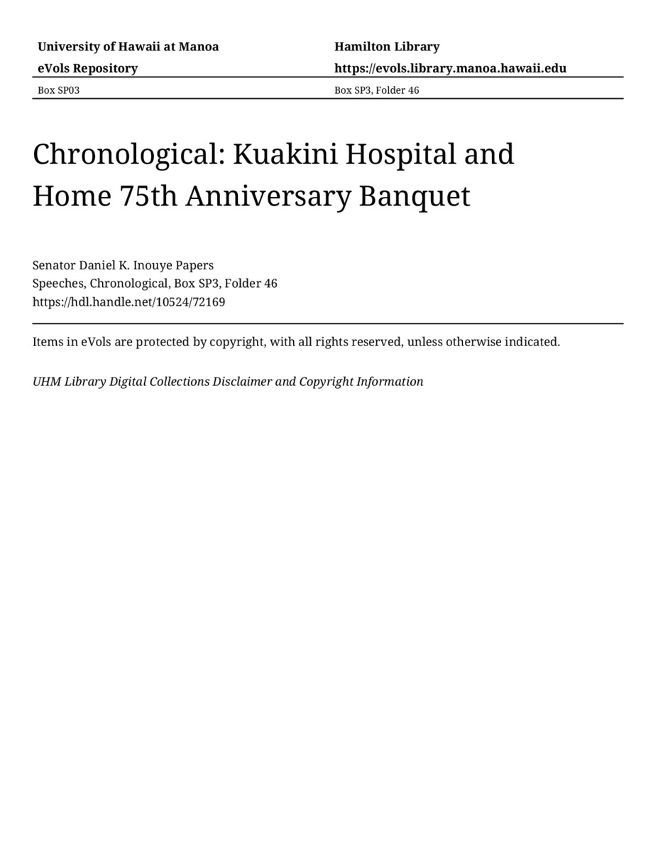 Kuakini Hospital and Home 75th Anniversary Banquet, September 12, 1975, MANUSCRIPT-HCPC00011, Speeches, Chronological, Box SP3, Folder 46, Senator Daniel K. Inouye Papers, Hawaiʻi Congressional Papers Collection, University of Hawaiʻi at Mānoa Library, Honolulu, HI. https://omekas-congress.lib.wvu.edu/catalog/10524_72169 (accessed April 12, 2026).