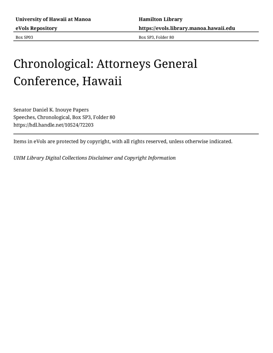 Attorneys General Conference, Hawaii, December 14, 1976, MANUSCRIPT-HCPC00011, Speeches, Chronological, Box SP3, Folder 80, Senator Daniel K. Inouye Papers, Hawaiʻi Congressional Papers Collection, University of Hawaiʻi at Mānoa Library, Honolulu, HI. https://omekas-congress.lib.wvu.edu/catalog/10524_72203 (accessed April 12, 2026).