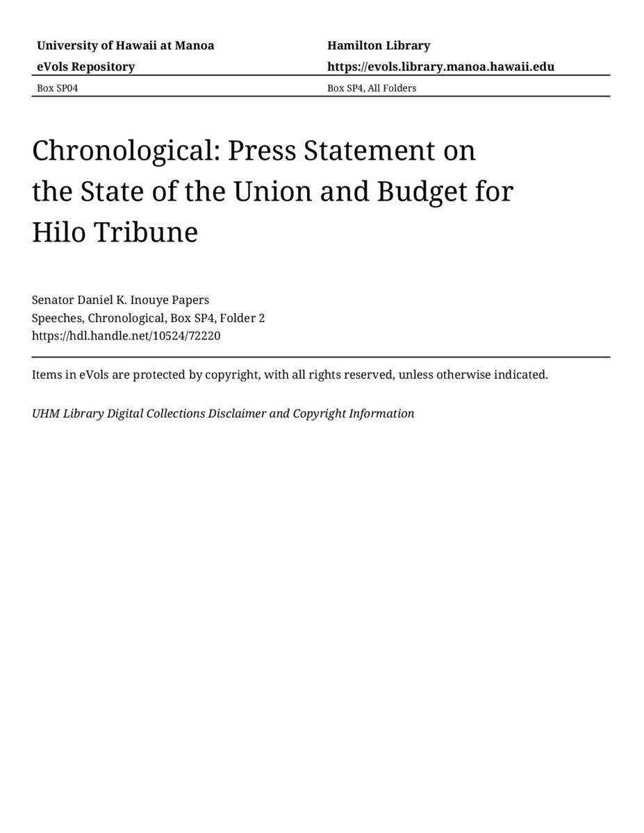 - Press Statement on the State of the Union and Budget for Hilo Tribune