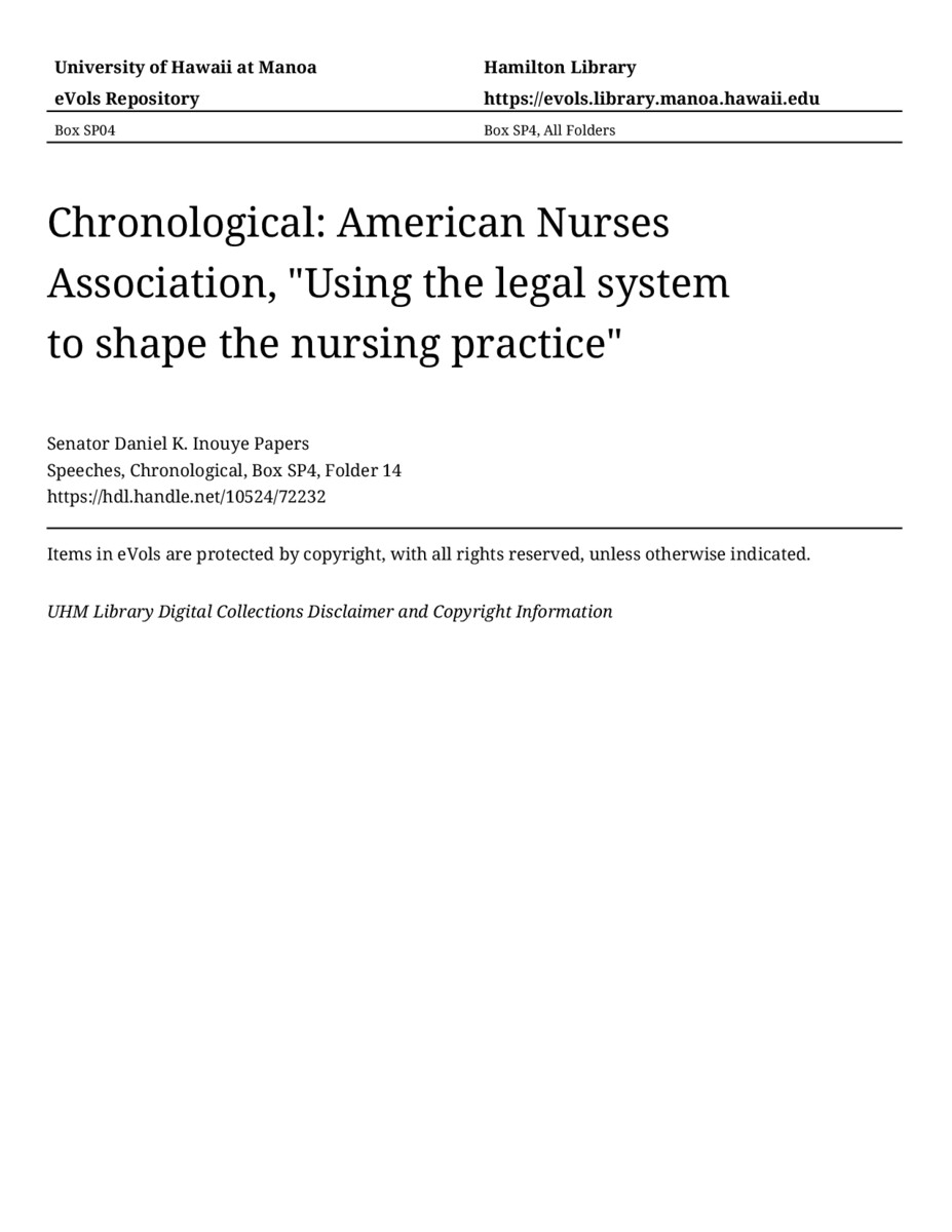 - American Nurses Association, "Using the legal system to shape the nursing practice"