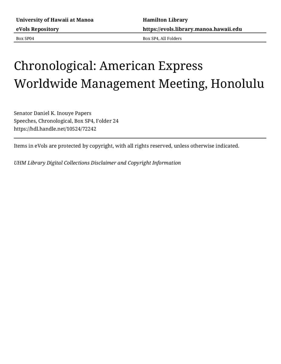 American Express Worldwide Management Meeting, Honolulu, May 11, 1979, MANUSCRIPT-HCPC00011, Speeches, Chronological, Box SP4, Folder 24, Senator Daniel K. Inouye Papers, Hawaiʻi Congressional Papers Collection, University of Hawaiʻi at Mānoa Library, Honolulu, HI. https://omekas-congress.lib.wvu.edu/catalog/10524_72242 (accessed April 17, 2026).