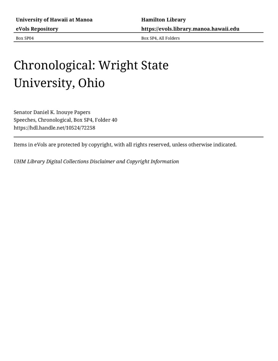 Wright State University, Ohio, September 14, 1979, MANUSCRIPT-HCPC00011, Speeches, Chronological, Box SP4, Folder 40, Senator Daniel K. Inouye Papers, Hawaiʻi Congressional Papers Collection, University of Hawaiʻi at Mānoa Library, Honolulu, HI. https://omekas-congress.lib.wvu.edu/catalog/10524_72258 (accessed April 22, 2026).