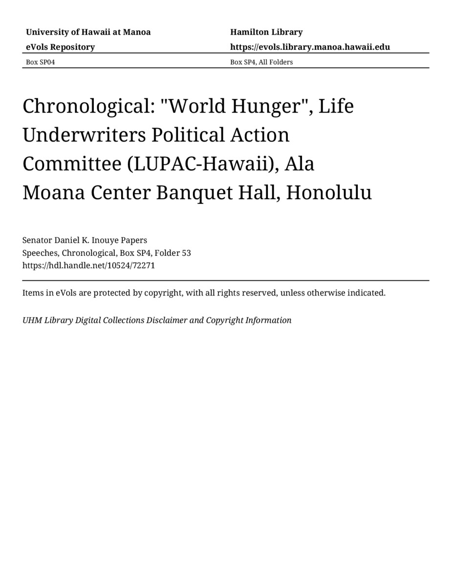 - "World Hunger", Life Underwriters Political Action Committee (LUPAC-Hawaii), Ala Moana Center Banquet Hall, Honolulu
