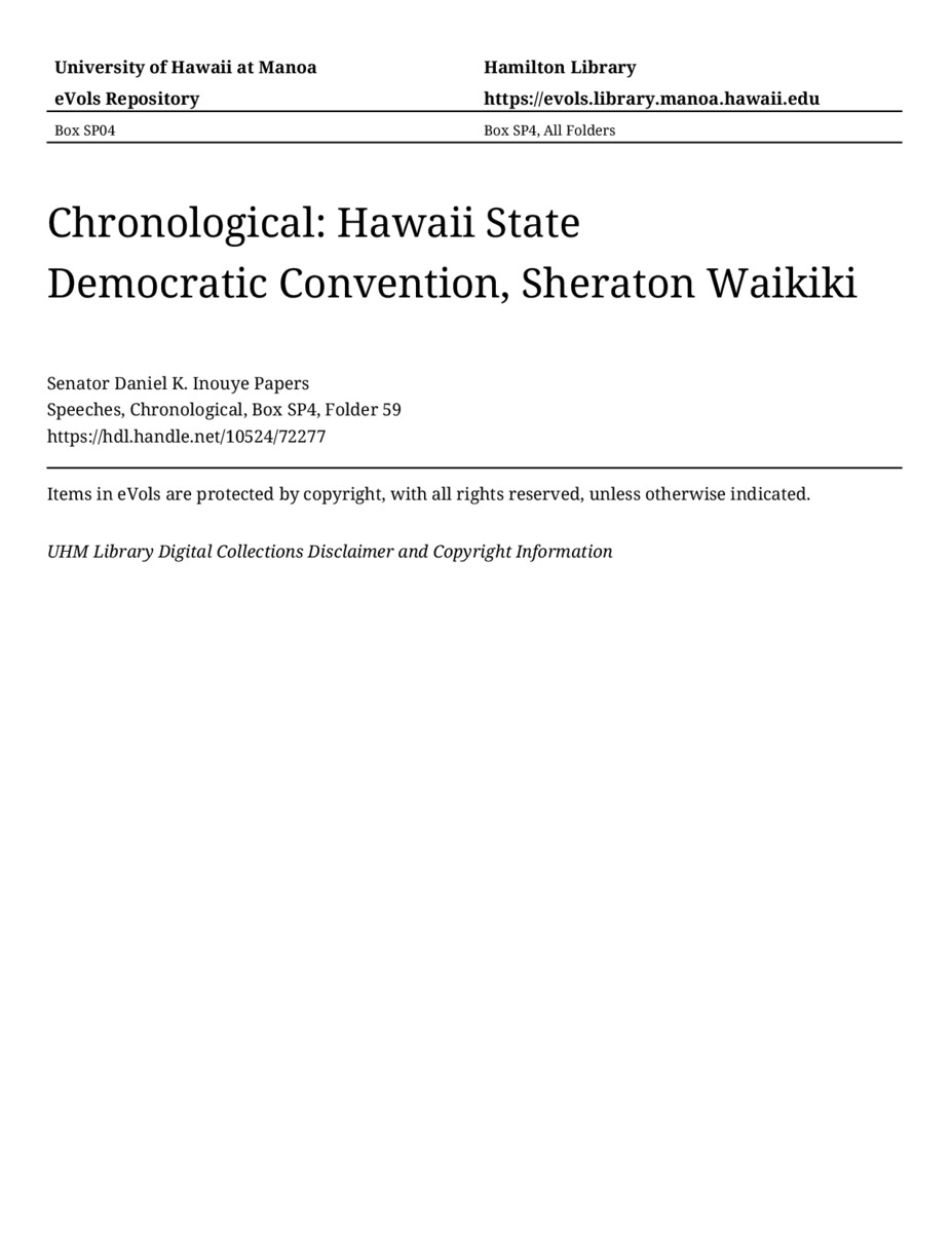 Hawaii State Democratic Convention, Sheraton Waikiki, May 31, 1980, MANUSCRIPT-HCPC00011, Speeches, Chronological, Box SP4, Folder 59, Senator Daniel K. Inouye Papers, Hawaiʻi Congressional Papers Collection, University of Hawaiʻi at Mānoa Library, Honolulu, HI. https://omekas-congress.lib.wvu.edu/catalog/10524_72277 (accessed April 24, 2026).