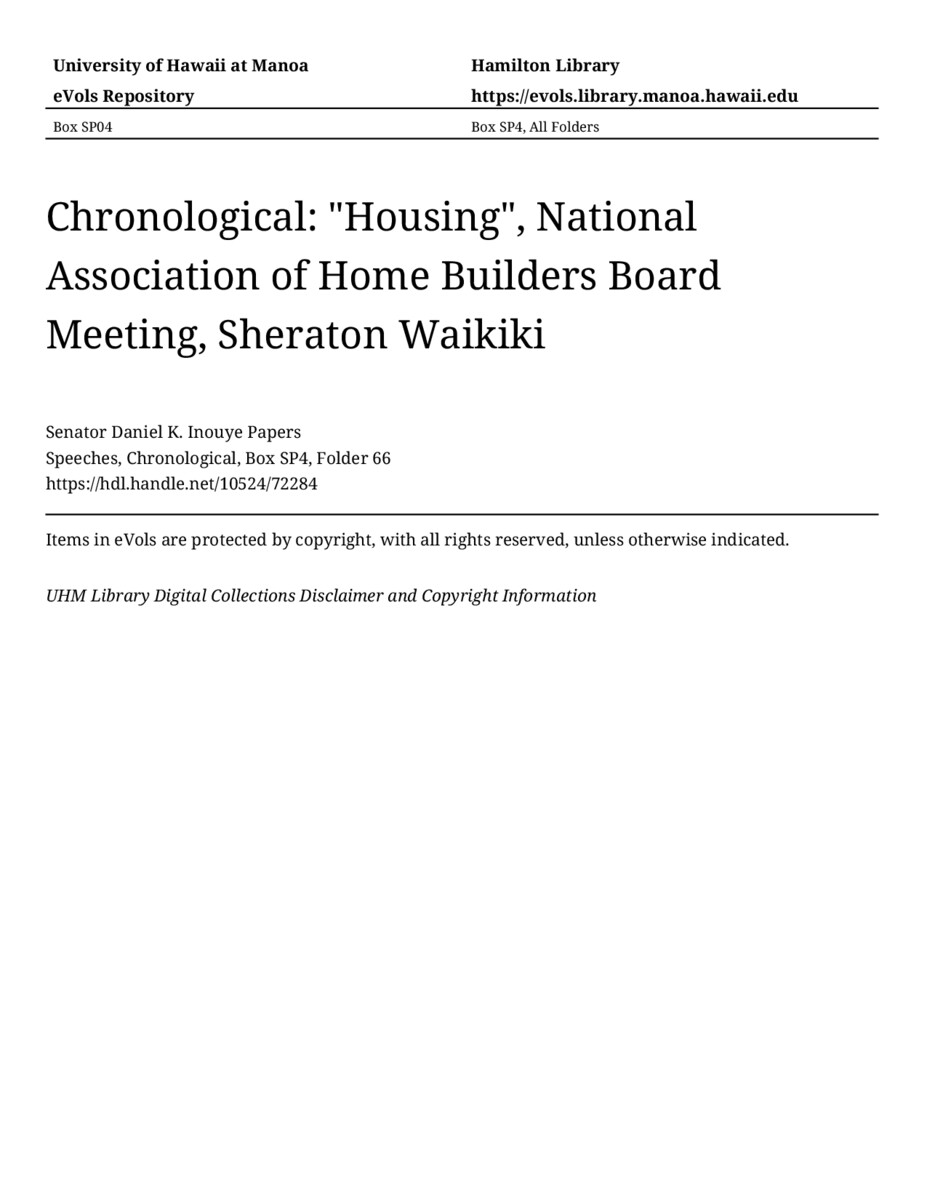 "Housing", National Association of Home Builders Board Meeting, Sheraton Waikiki