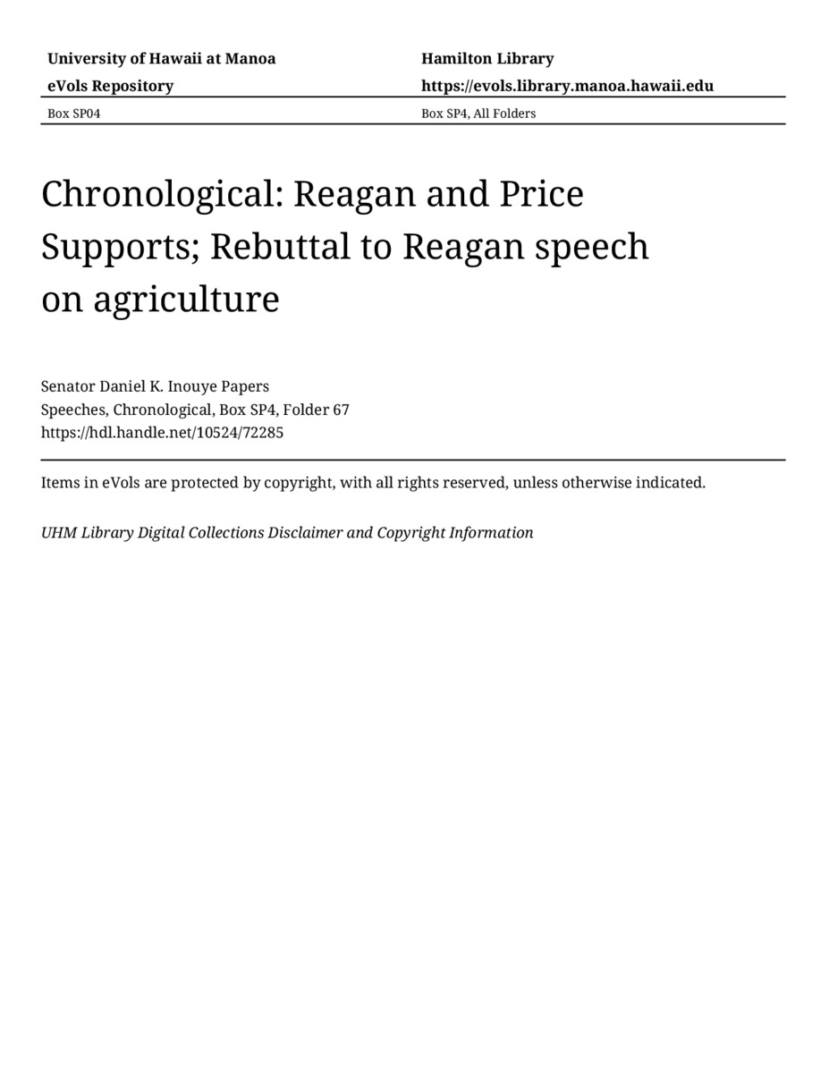 - Reagan and Price Supports; Rebuttal to Reagan speech on agriculture
